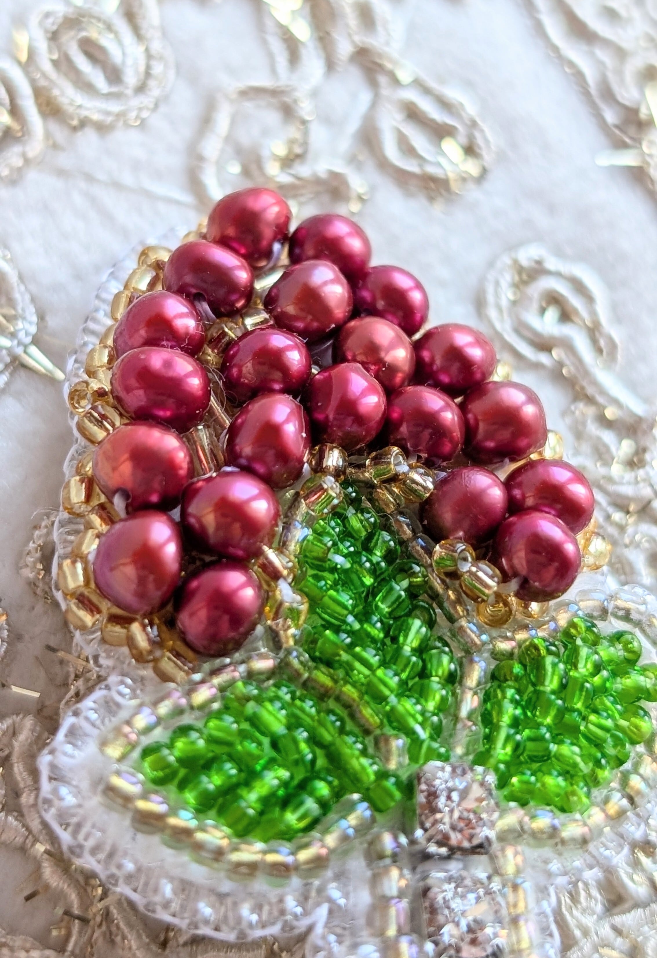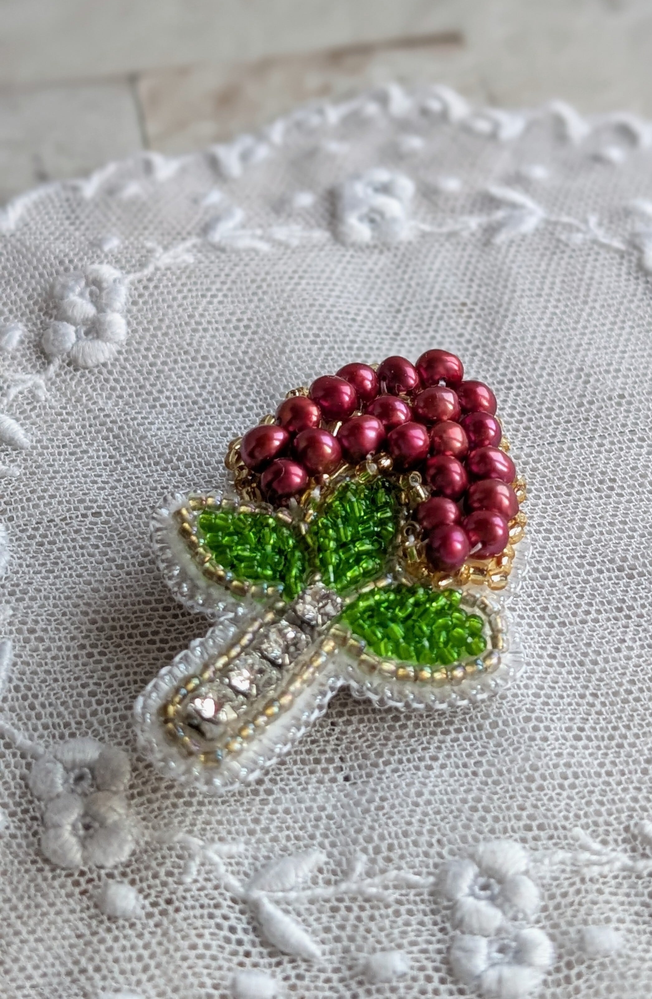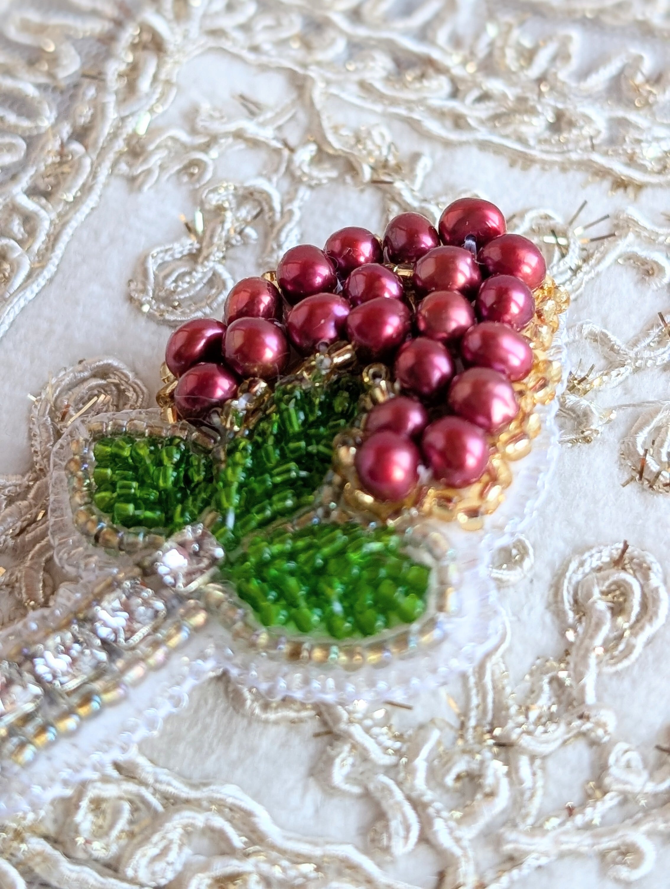 縁起の良い赤南天をモチーフにした、ビーズ刺繍のブローチです。
