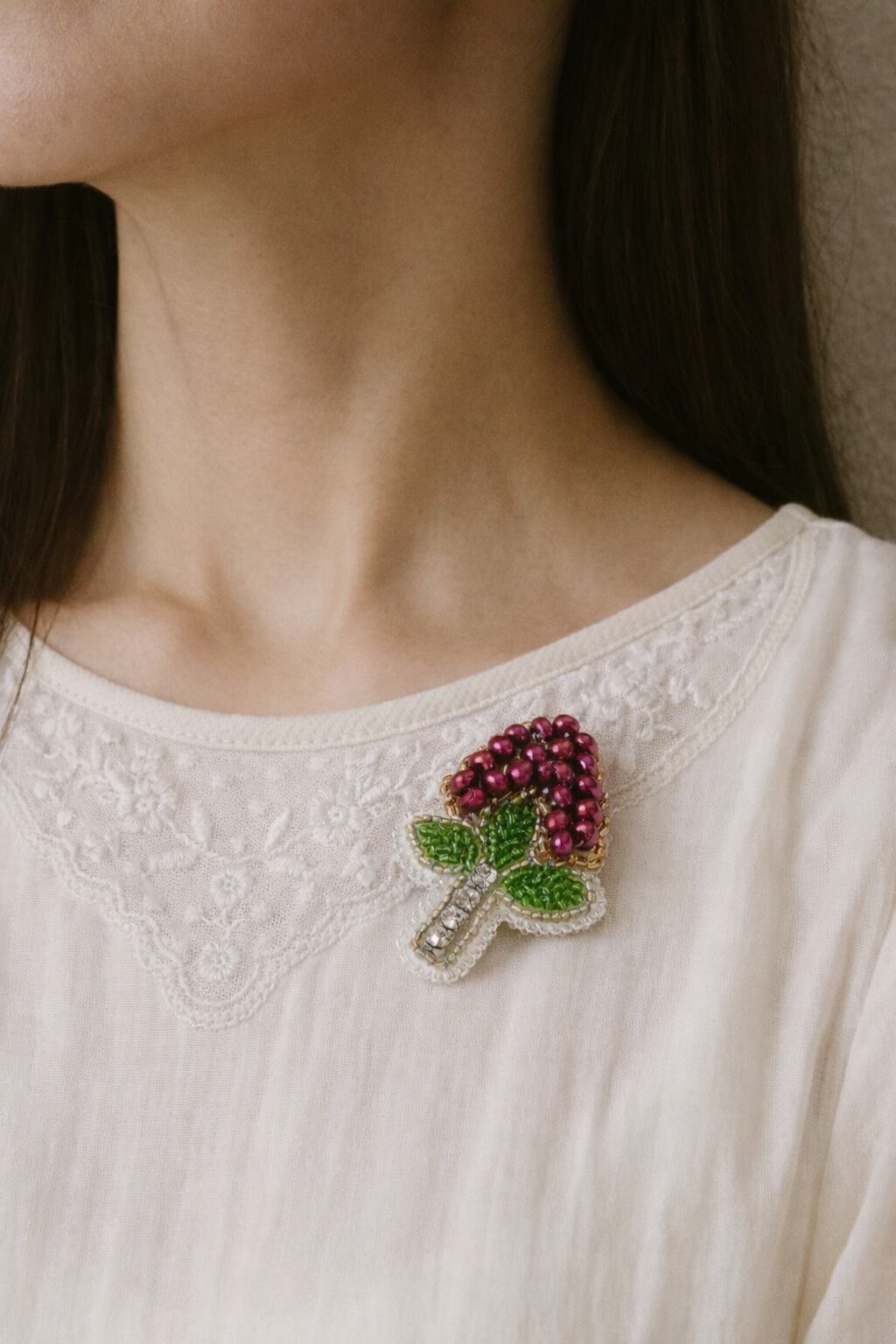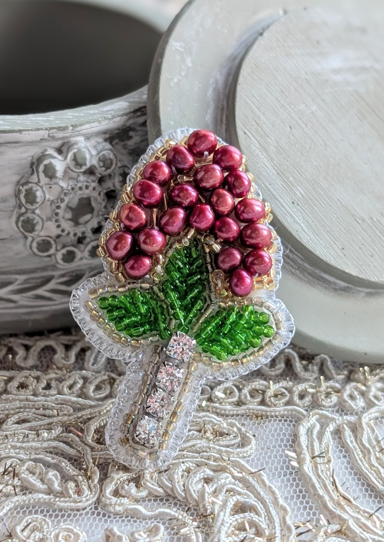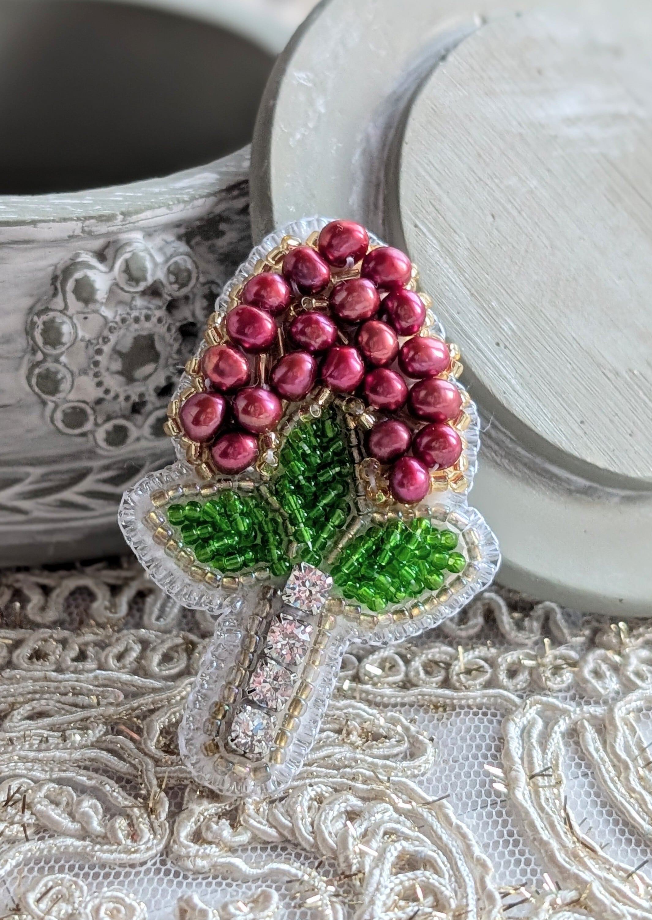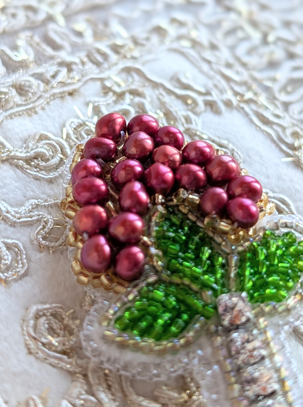 縁起の良い赤南天をモチーフにした、ビーズ刺繍のブローチです。
